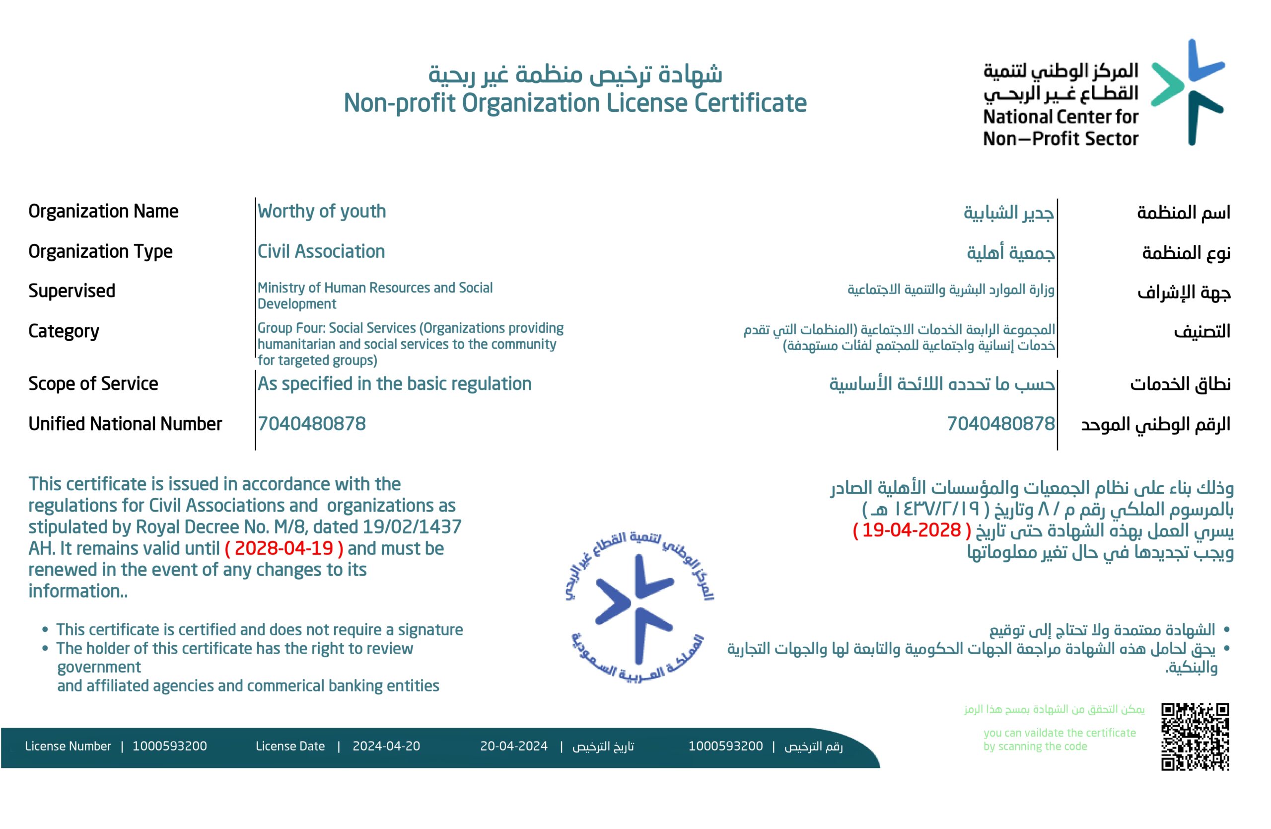 جمعية جدير الشبابية هي جمعية أهلية مرخصة من المركز الوطني لتنمية القطاع غير الربحي برقم (1000593200) تُعنى بتمكين الشباب وتنمية قدراتهم الشخصية والمهنية وإعدادهم ليكونوا مساهمين فاعلين في تنمية مجتمعهم وبناء وطنهم.